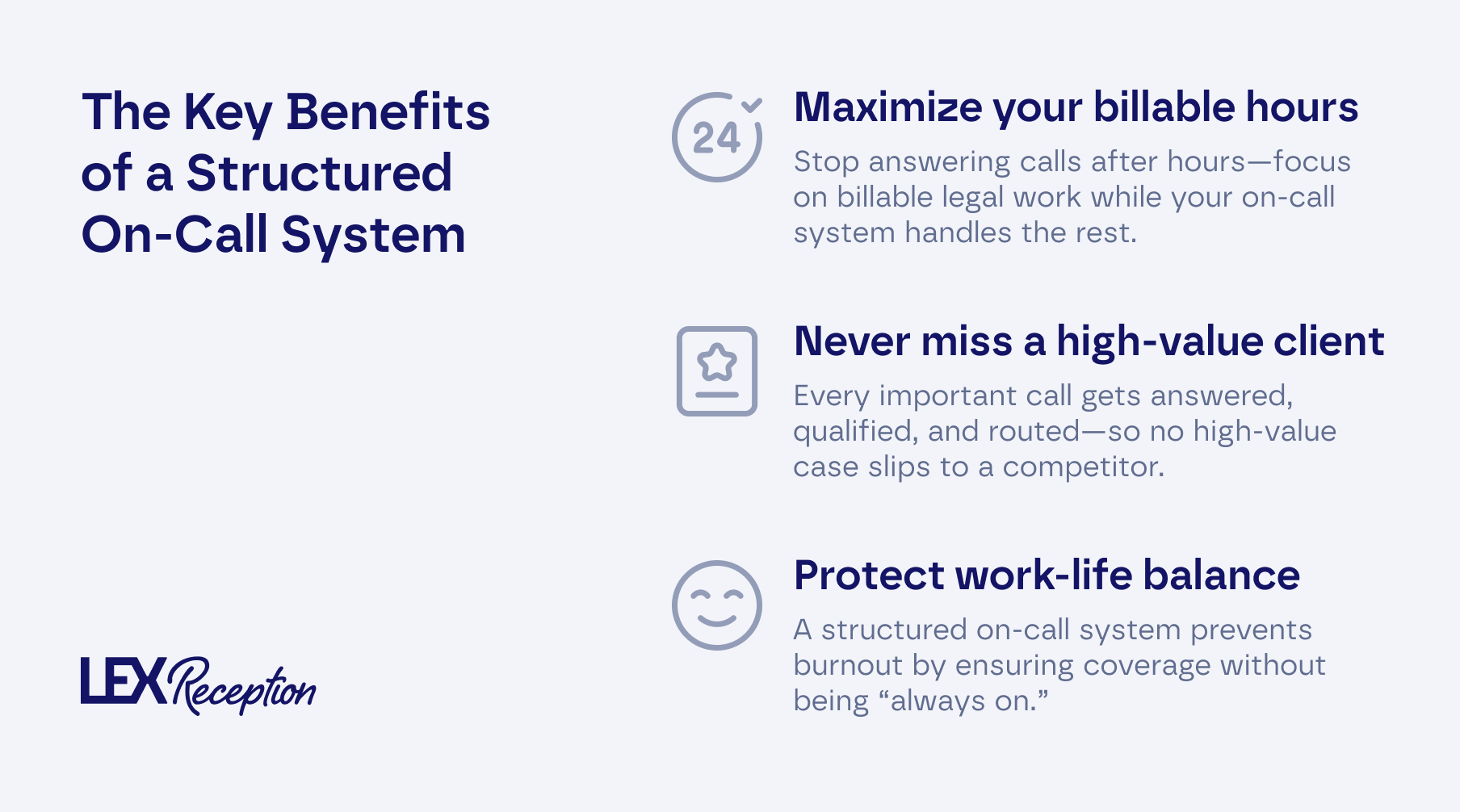 Administrative tasks are the enemy of productivity. Time spent managing call schedules, answering routine inquiries after hours, and filtering spam calls is time you can’t bill. An on-call system, especially one managed by a partner like LEX Reception, frees you to focus on what you do best: practicing law. By delegating call handling, you can reclaim valuable hours and dedicate them to billable case work, ultimately boosting your firm’s revenue.